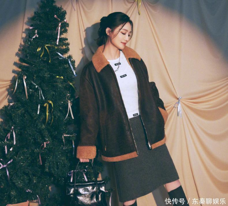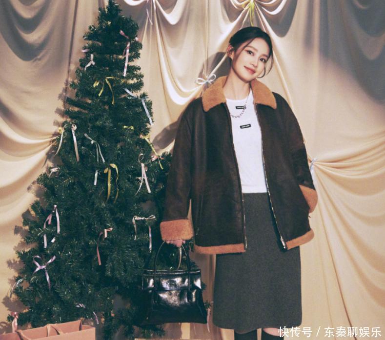 网友们就想到圣诞节就在这个月了,这波照片也是充满了氛围感。她穿着一件咖啡色的外套,领子看着像那种羊羔绒的,应该很暖和,用白色的衣服打底。搭配的是一条灰色的半身裙,穿着一双黑色的高筒靴子,手里拿着一个黑色的包包。